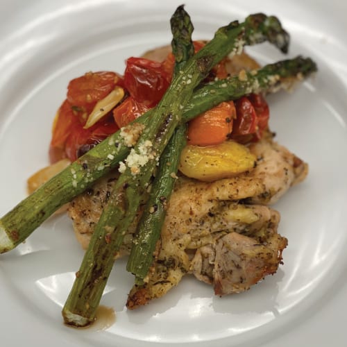 This Week’s Dinner This week we used one of our favorite recipes from last week, the Roasted Cherry Tomatoes to add an additional pop to our Grilled Italian Chicken Dinner. You can easily modify that recipe to add some garlic and Italian seasoning and top with fresh basil to compliment
